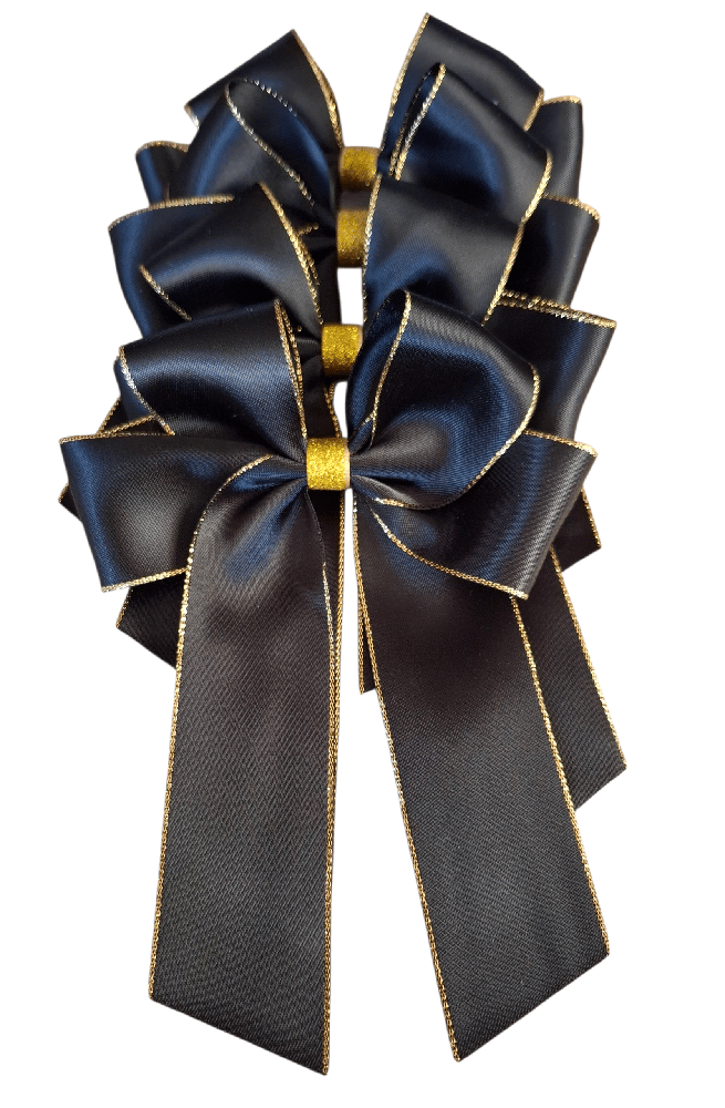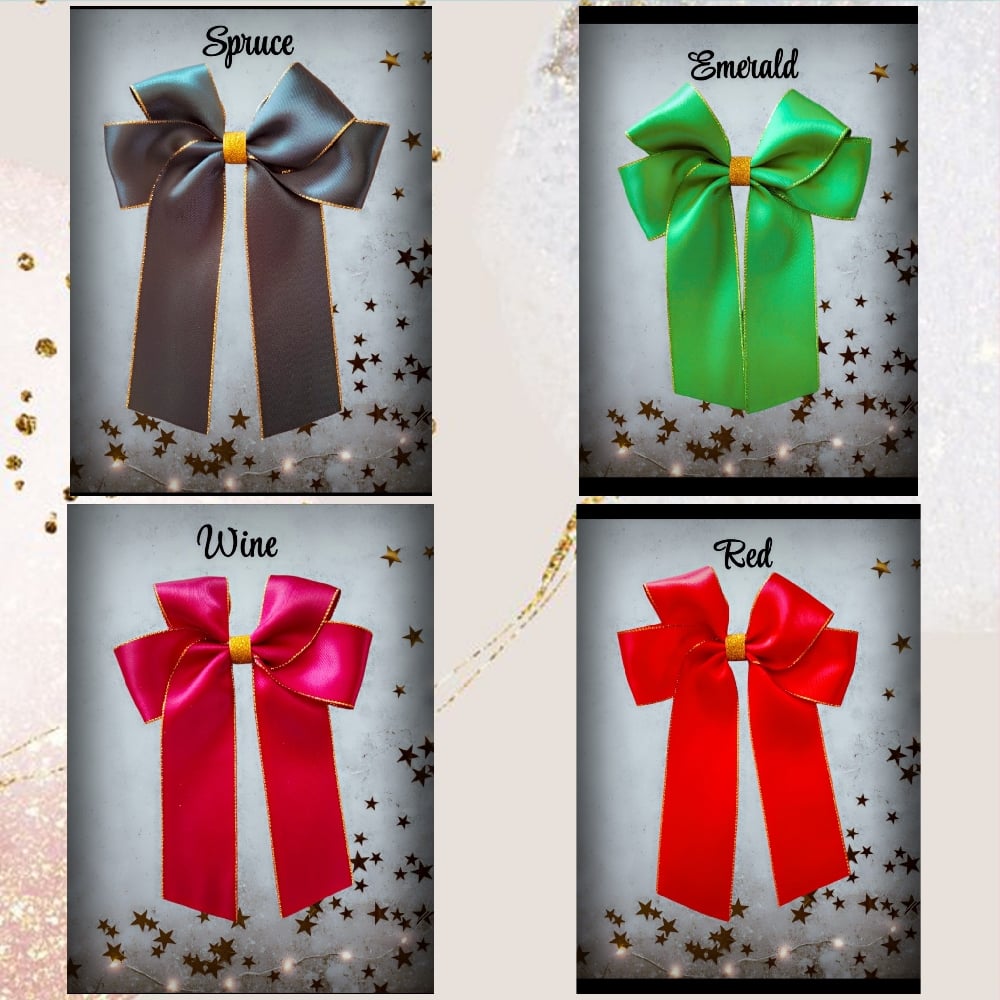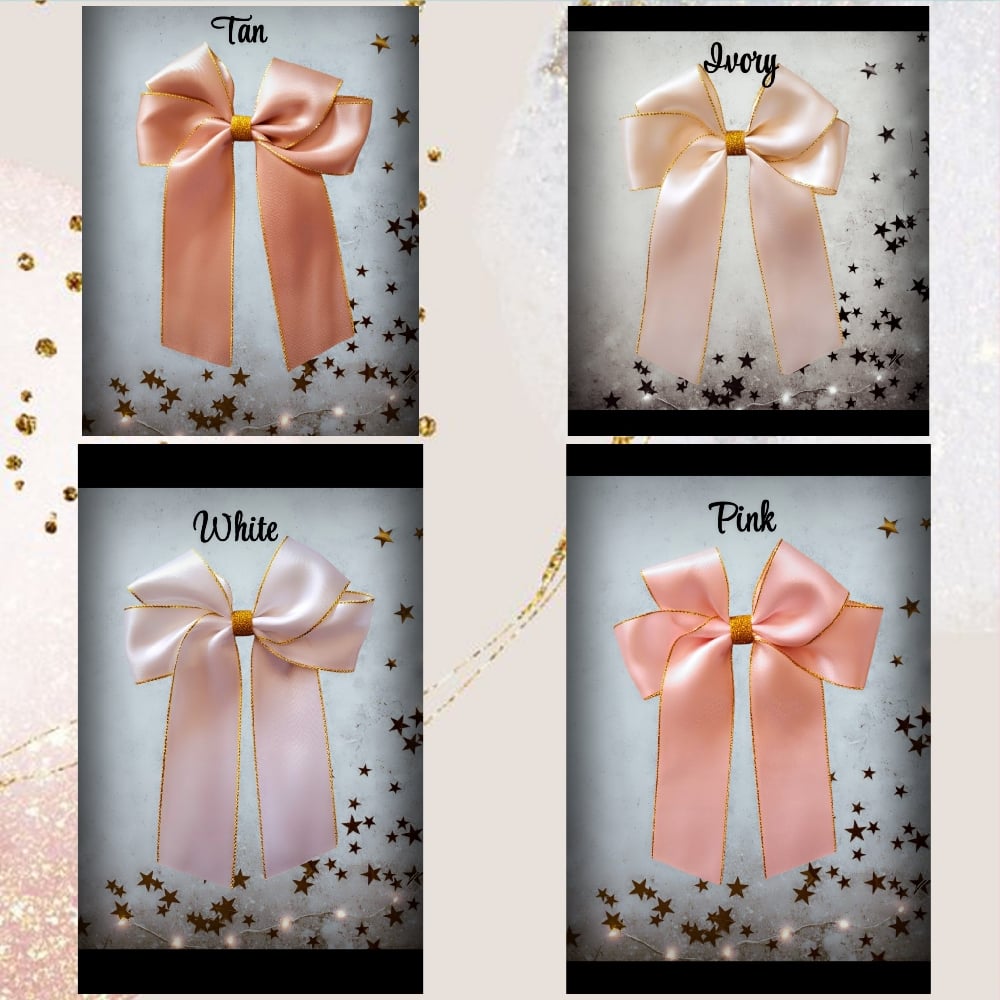 5" Satin bows with gold edge and glitter gold ribbon centers.